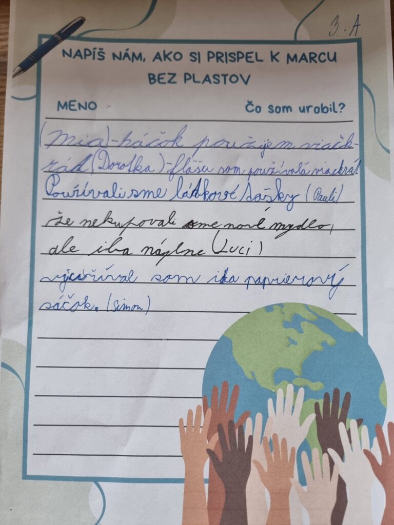 Aktívne sa zapájali rôznymi spôsobmi – triedili odpad, nosili si desiaty v opakovane použiteľných krabičkách, vyhýbali sa jednorazovým obalom či pravidelne zálohovali plastové fľaše. Veľmi nás potešilo, že svoje skúsenosti a nápady zdieľali aj navzájom: