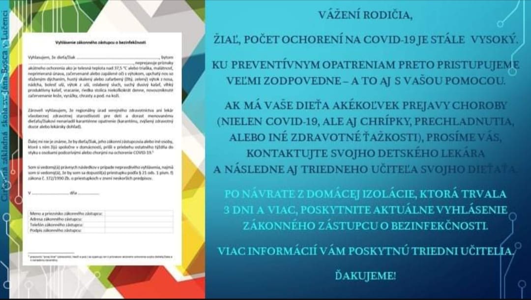 ·        stále platí, že ak žiak pri prezenčnom vzdelávaní chýba 3 po sebe nasledujúce dni, je potrebné doniesť potvrdenie o bezinfekčnosti,
